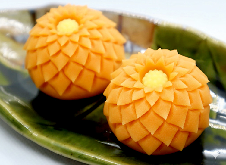 細工鋏(さいくばさみ)と言う製菓用の鋏を用い、練切の花びらを1枚ずつ細かく切って仕上げる「はさみ菊」を2点お作りいただけます。