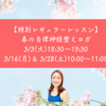 2026年2月1日 / 最終更新日時 : 2026年2月3日 せんだ ボディワークスタジオ 3/3(火)・3/16(月)・3/28(土)【特別レギュラーレッスン】春の自律神経整えヨガ ~特別レギュラーレッスン~ 【女性限定レッスン】 アクティブ度:★★☆ 季節が移り変わりゆく時期。 なんだかせわしなくて、肩にぐっと力が入ってしまう時もありますよね。 そんな時は、ヨガのポーズや呼吸に意識を向けて、自 […]