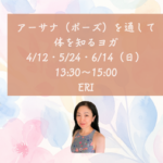 2026年3月10日 / 最終更新日時 : 2026年3月26日 せんだ ボディワークスタジオ 4/12・5/24・6/14(日)アーサナ(ポーズ)を通して体を知るヨガ~ヨガ初心者から経験者までOKのイベントレッスン ~自分の体の癖をヨガで改善~ アクティブ度:★★☆ 【女性限定レッスン】 普段から疑問に思っているポーズの取り方、体の癖を修正の仕方を学びます。 ヨガを通して、普段の自分の体の癖を知り、姿勢を正すきっかけにつなげまし […]